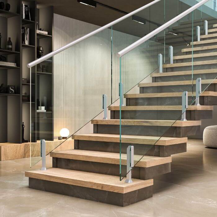 EMBERA aluminium top-mount baluster with routel system is designed for both interior and exterior applications, where a clean gap between the floor and the lower edge of the glass is desired. This system features two balusters holding each glass panel securely, supported through routels connected to the baluster posts.