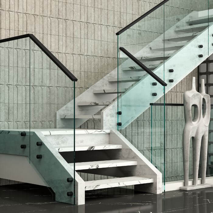 The EMBERA MB BSP 40 aluminium side-mount spigot glass railing system can be used for both interior and exterior applications. It is most commonly preferred for interior staircases, where it delivers a fully exposed, modern aesthetic.